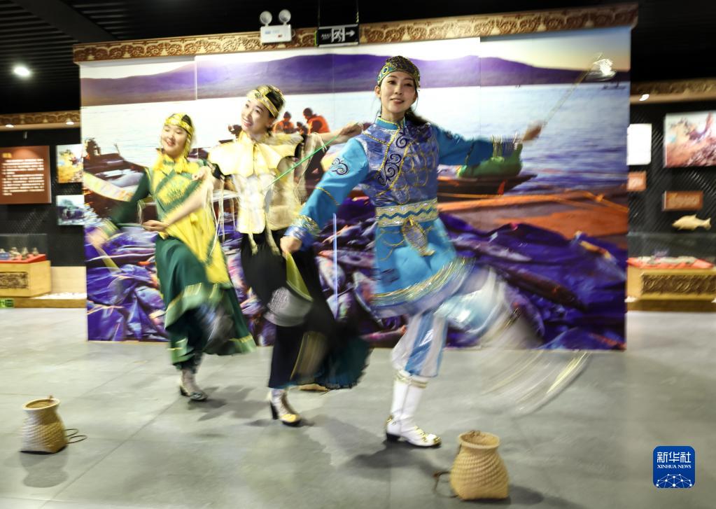 9月4日,在黑龍江撫遠市烏蘇鎮抓吉赫哲族村赫哲民俗展示館內,尚美含(右一)和赫哲族女孩一起表演民族舞蹈。