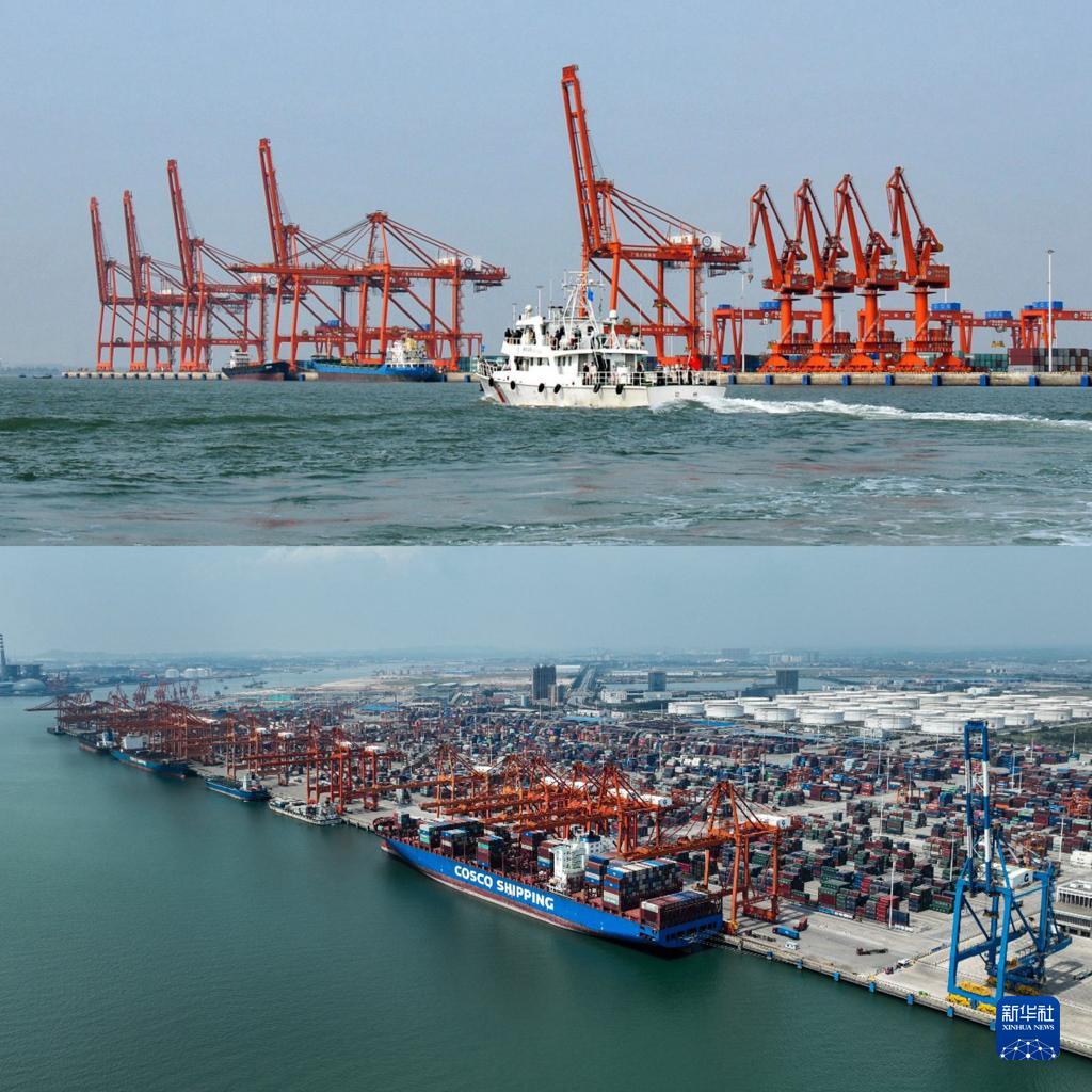 拼版照片:上圖為2010年的欽州港碼頭作業(yè)區 (2010年11月29日攝);下圖為2022年的欽州港碼頭作業(yè)區(2022年8月28日攝,無(wú)人機照片)。