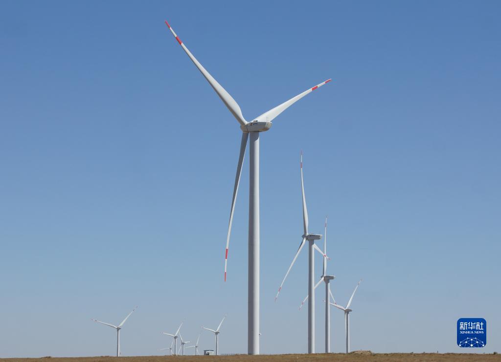 這是9月13日拍攝的哈薩克斯坦札納塔斯風(fēng)電場(chǎng)風(fēng)機。