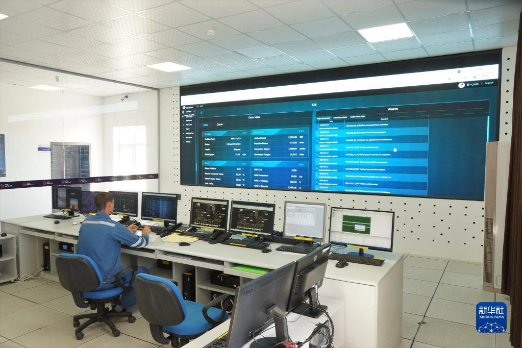 這是9月13日拍攝的哈薩克斯坦札納塔斯風(fēng)電場(chǎng)控制中心。
