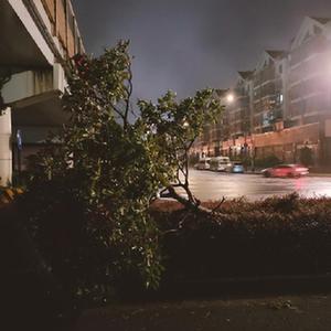 9月14日晚拍攝的浙江省舟山市普陀區東港海洲路綠化帶上被風(fēng)吹倒的樹(shù)木(手機照片)。