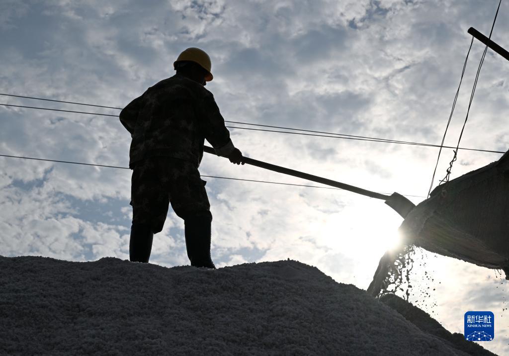 工人在天津長(cháng)蘆漢沽鹽場(chǎng)整理鹽坨(9月14日攝)。