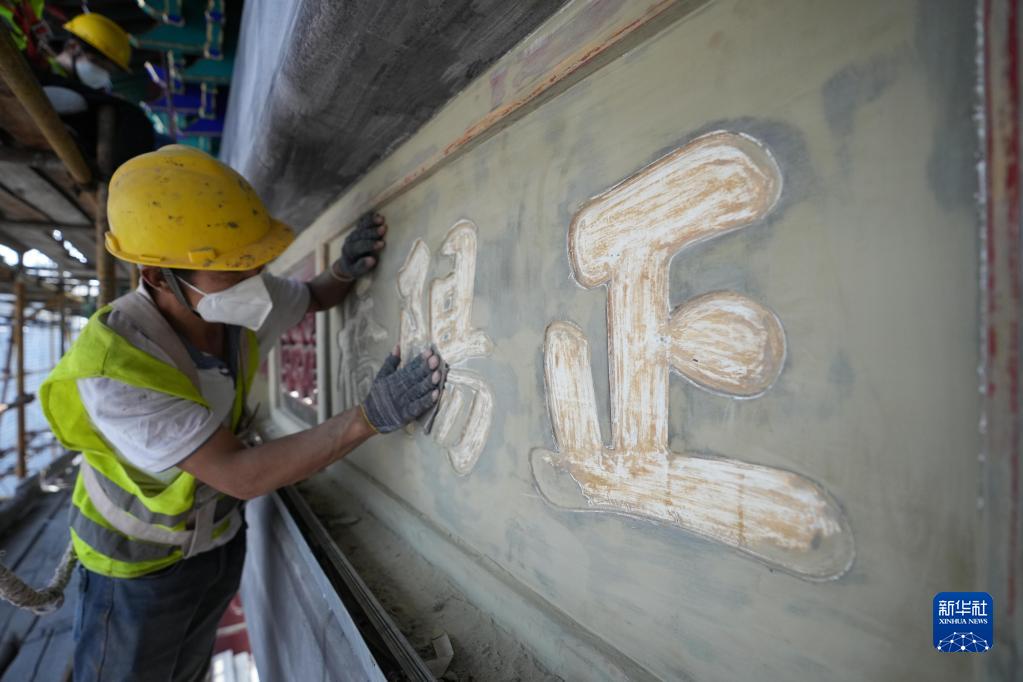 9月15日,施工修繕人員在前門(mén)五牌樓進(jìn)行打磨作業(yè),為油飾彩繪翻新做準備。