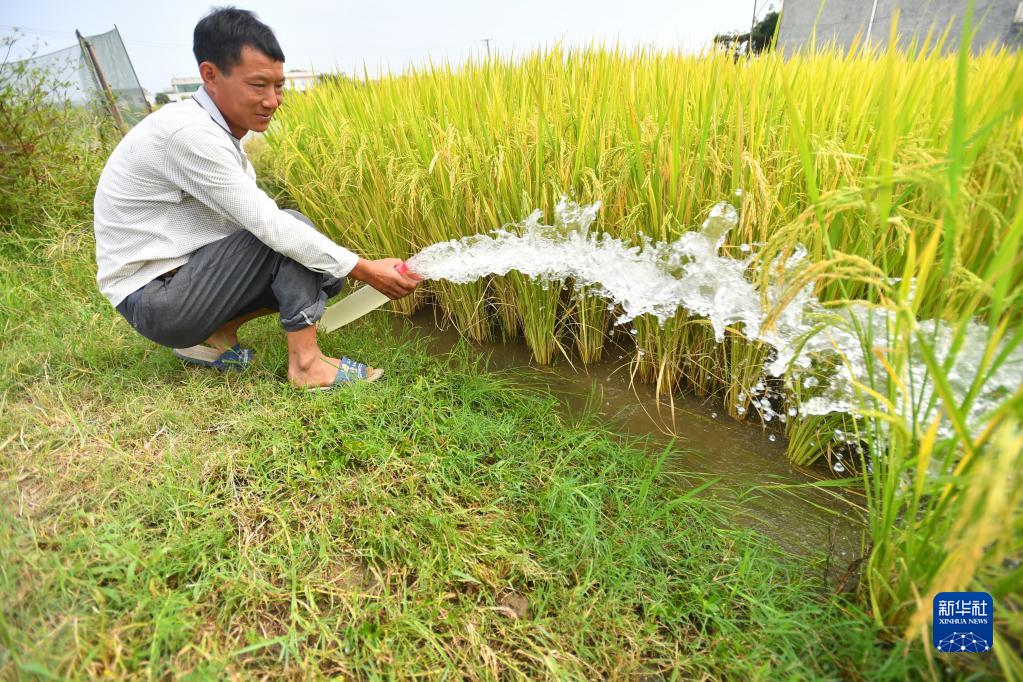 9月15日,在湘潭市雨湖區姜畬鎮泉塘子村,村民用剛抽來(lái)的水灌溉稻田。