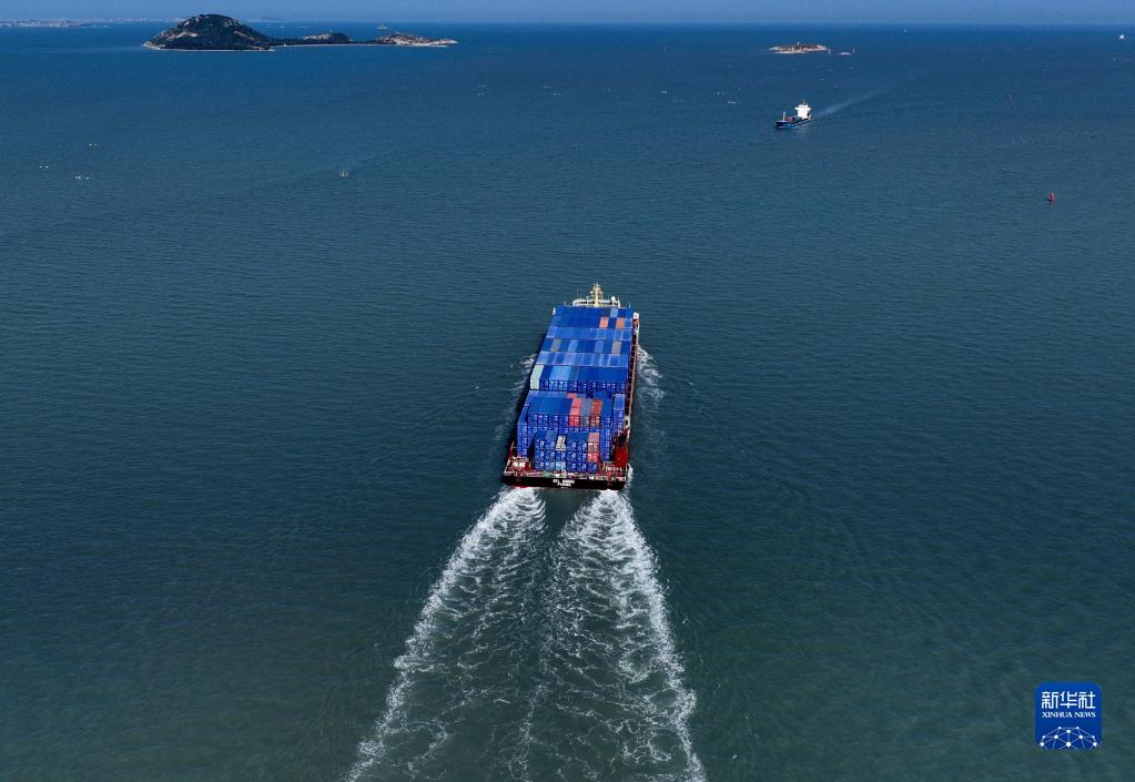 9月15日,“沃德菲寧波”號集裝箱輪行駛在海上(無(wú)人機照片)。