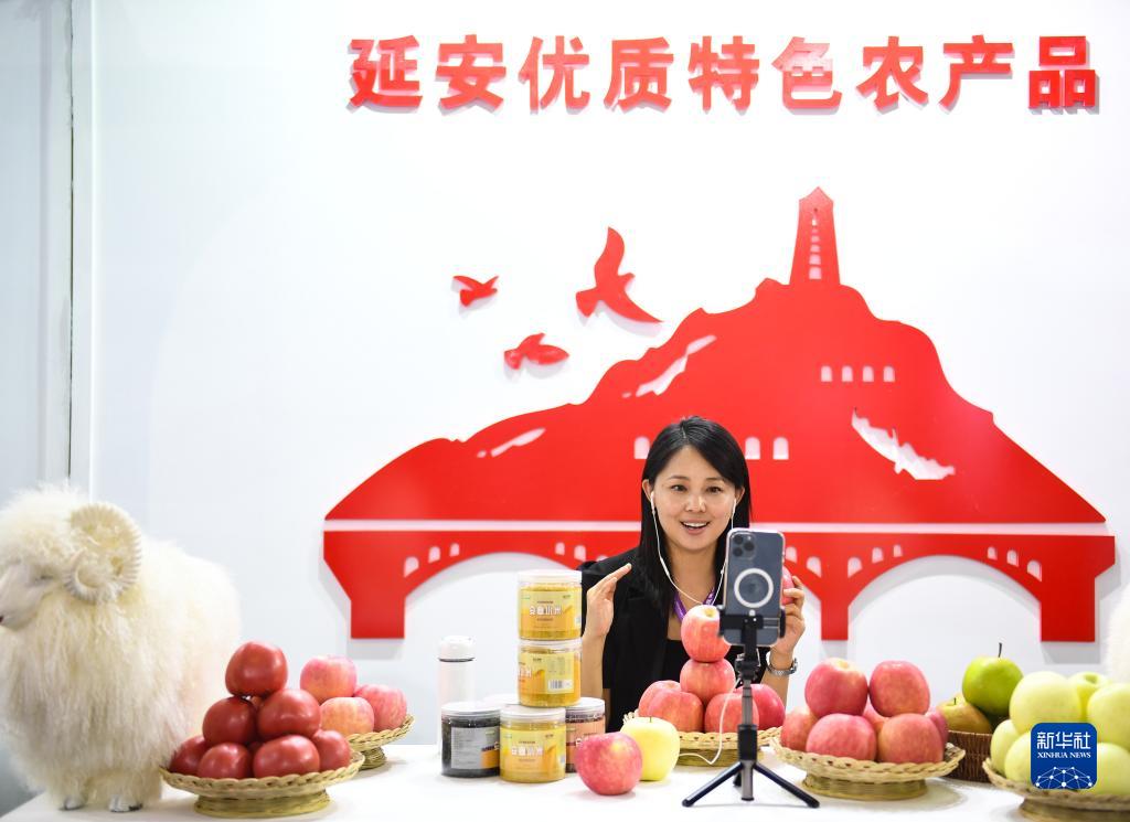 9月15日,在農業(yè)科技示范推廣應用展館延安展區,主播在介紹特色農產(chǎn)品。