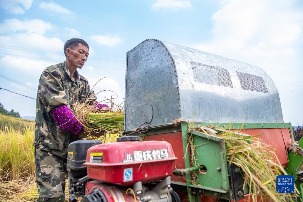 9月14日,在重慶市酉陽(yáng)土家族苗族自治縣花田鄉,稻農在稻田里搶收稻谷。