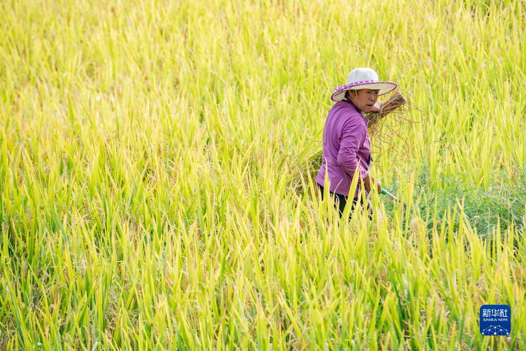 9月14日,在重慶市酉陽(yáng)土家族苗族自治縣花田鄉,稻農在稻田里搶收稻谷。 新華社記者 唐奕 攝