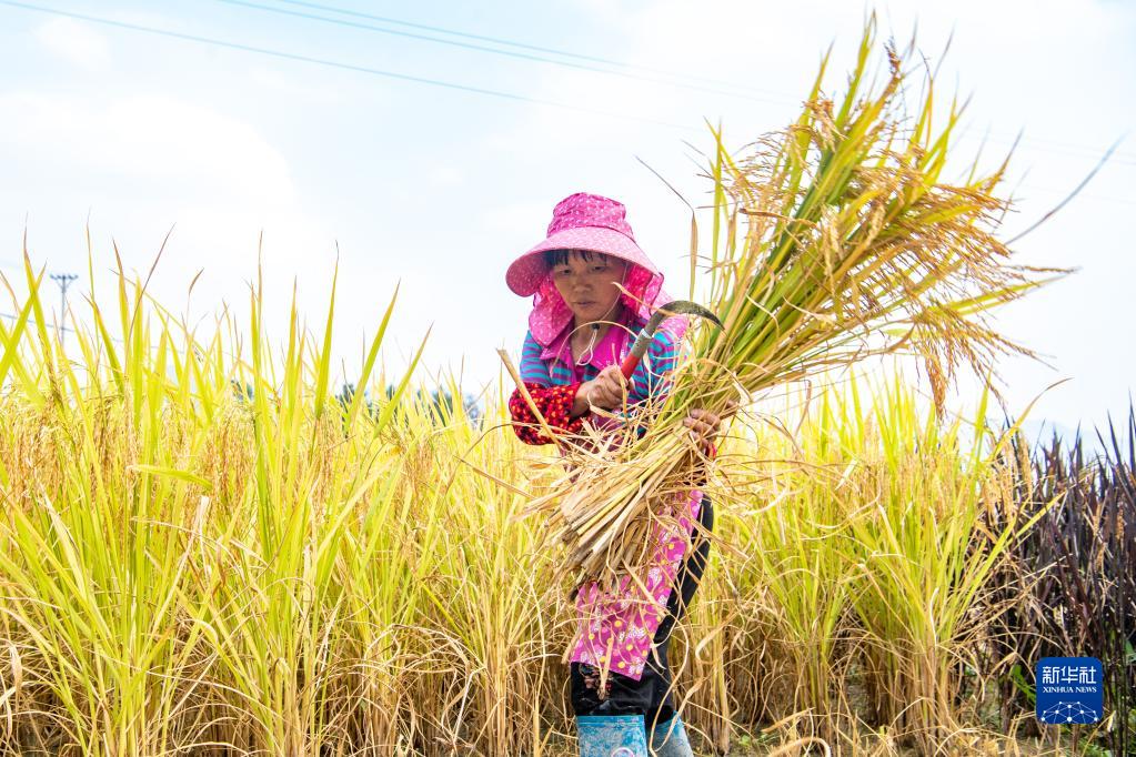 9月14日,在重慶市酉陽(yáng)土家族苗族自治縣花田鄉,稻農在稻田里搶收稻谷。 新華社記者 唐奕 攝