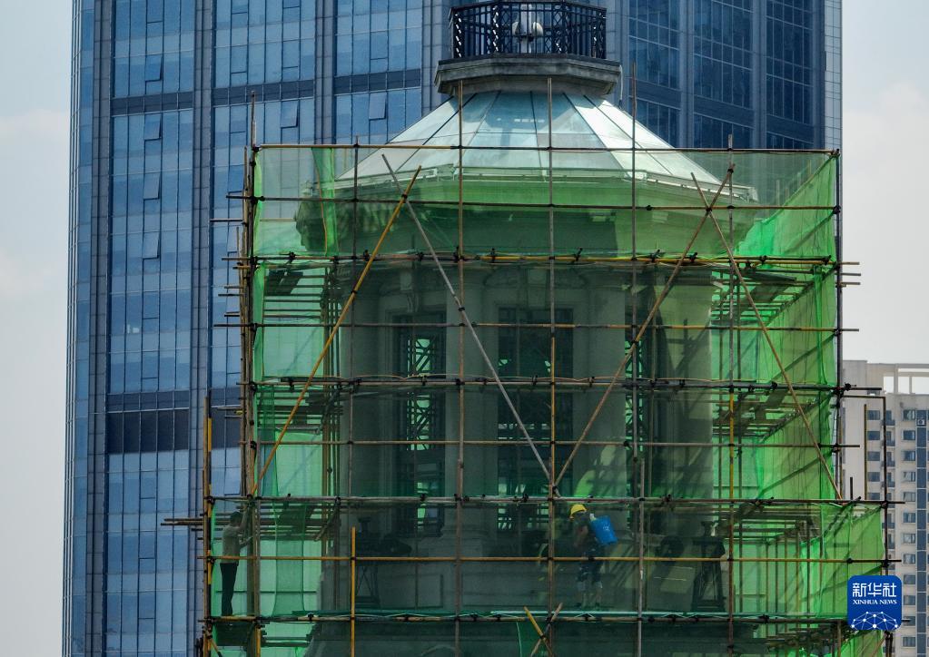 9月15日,工人們在對湖北武漢江漢關(guān)鐘樓進(jìn)行保護修繕(無(wú)人機照片)。