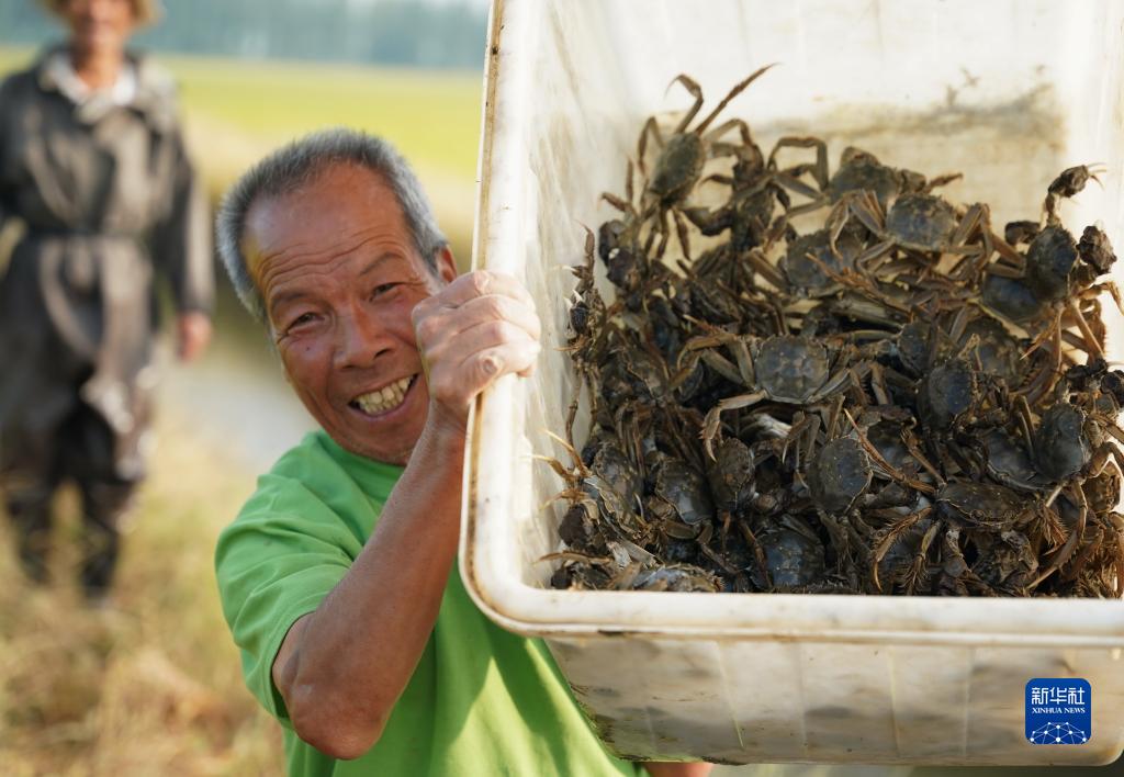 9月15日,蘆臺經(jīng)濟開(kāi)發(fā)區三分場(chǎng)農工在稻田內收獲河蟹。