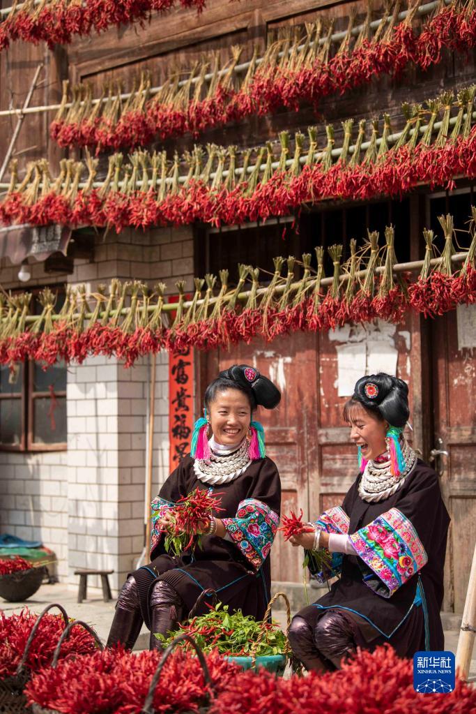 9月15日,貴州省從江縣東朗鎮擺啊村村民在晾曬朝天椒。