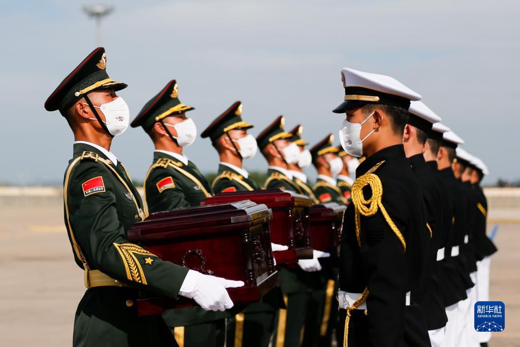 9月16日,在韓國仁川國際機場(chǎng),中國人民解放軍禮兵(左)從韓方接過(guò)中國人民志愿軍烈士棺槨。
