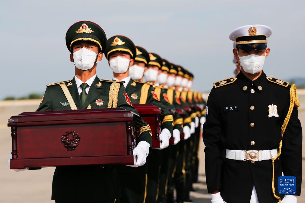 9月16日,在韓國仁川國際機場(chǎng),中國人民解放軍禮兵(左)從韓方接過(guò)中國人民志愿軍烈士棺槨。