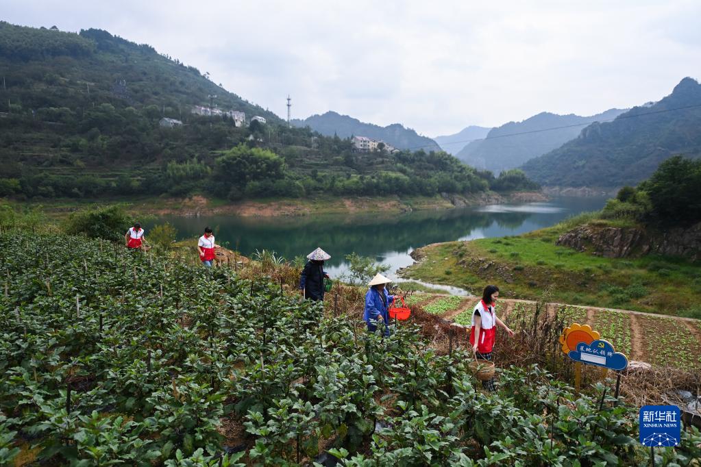 9月16日,在杭州市臨安區龍崗鎮望湖村“共富菜園”,黨員志愿者和村民在采摘茄子。