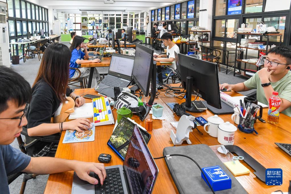 廣東工業(yè)大學(xué)學(xué)生在“工大創(chuàng )谷”創(chuàng )新創(chuàng )業(yè)工作室編寫(xiě)程序(9月14日攝)。