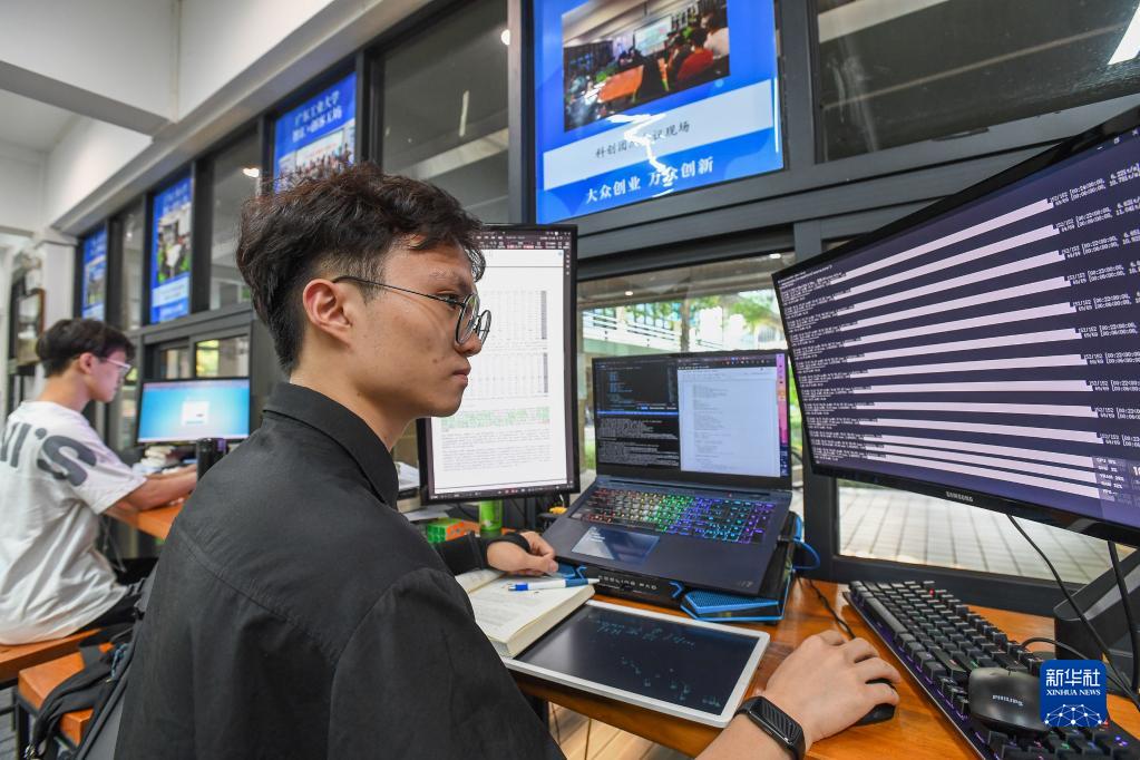 廣東工業(yè)大學(xué)“工大創(chuàng )谷”創(chuàng )客工坊團隊的梁梓熙(右)在編寫(xiě)計算機視覺(jué)深度學(xué)習程序(9月14日攝)。