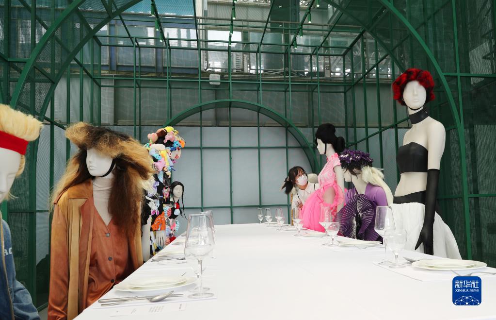 9月16日,一位參觀(guān)者在一組時(shí)裝設計展品旁駐足觀(guān)看。