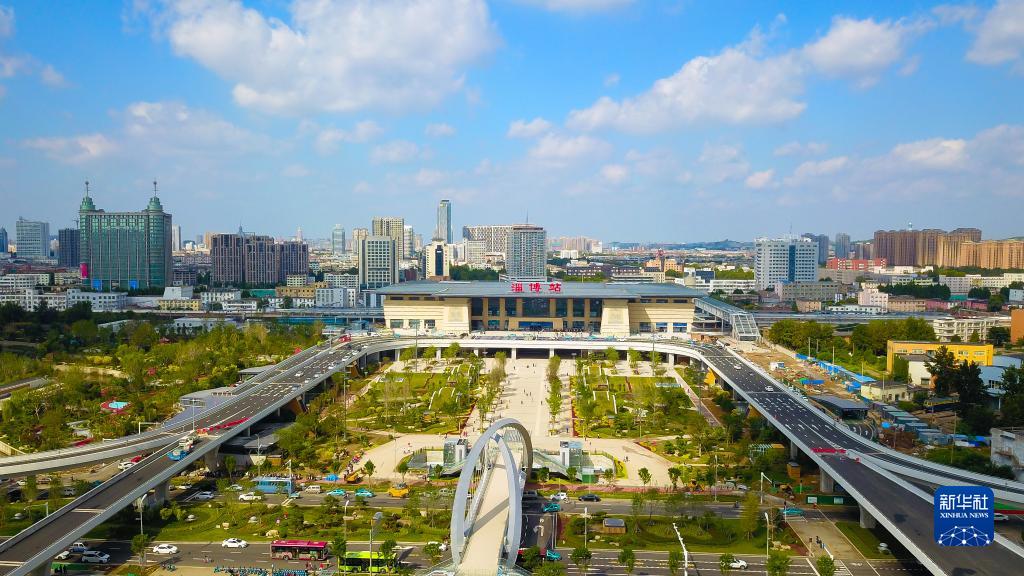 這是9月16日拍攝的新建淄博站南站房及南廣場(chǎng)交通樞紐工程(無(wú)人機照片)。