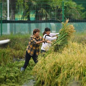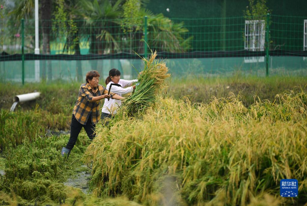 9月15日,農民在漢中市洋縣龍亭鎮一處稻漁綜合種養基地收割水稻。