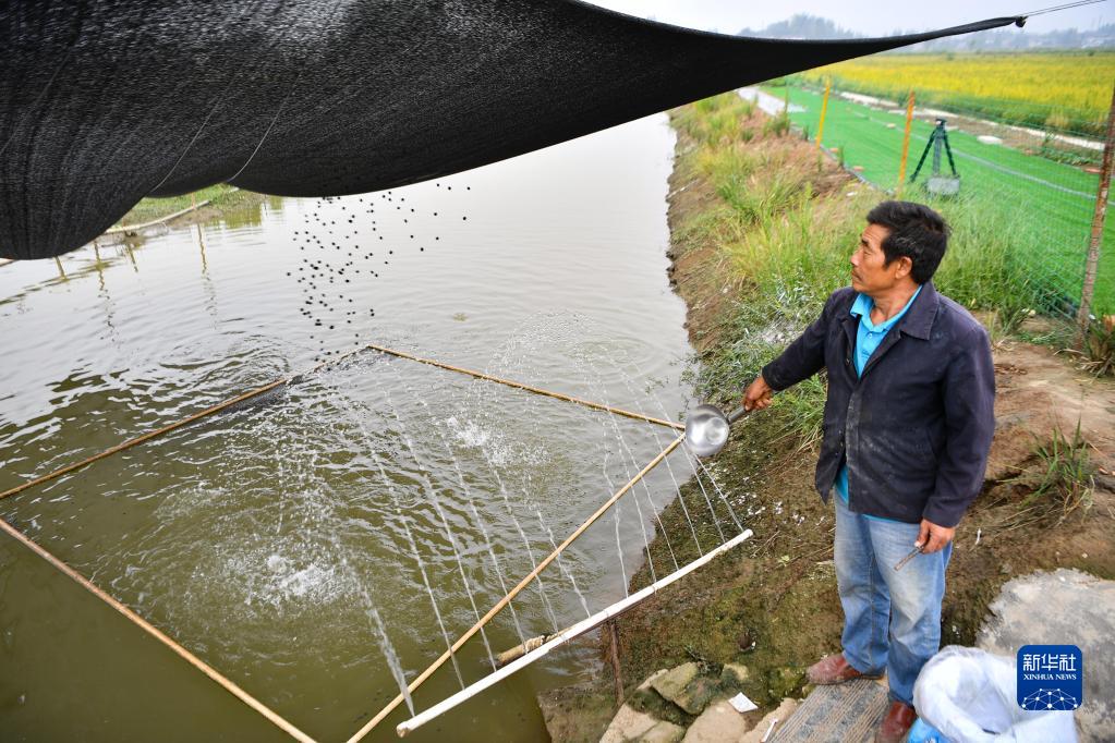 9月15日,養殖人員在漢中市洋縣馬暢鎮一處稻漁綜合種養基地向飼養的鱸魚(yú)投食。