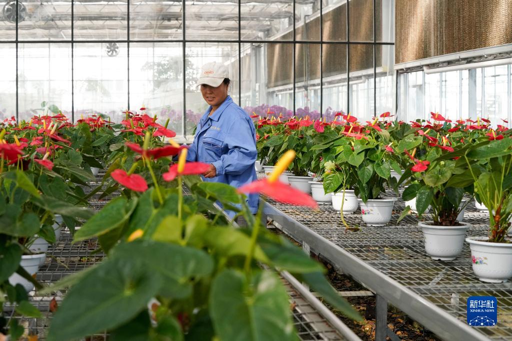 農民在興十四村現代農業(yè)示范園區大棚溫室中管理花卉作物(9月16日攝)。