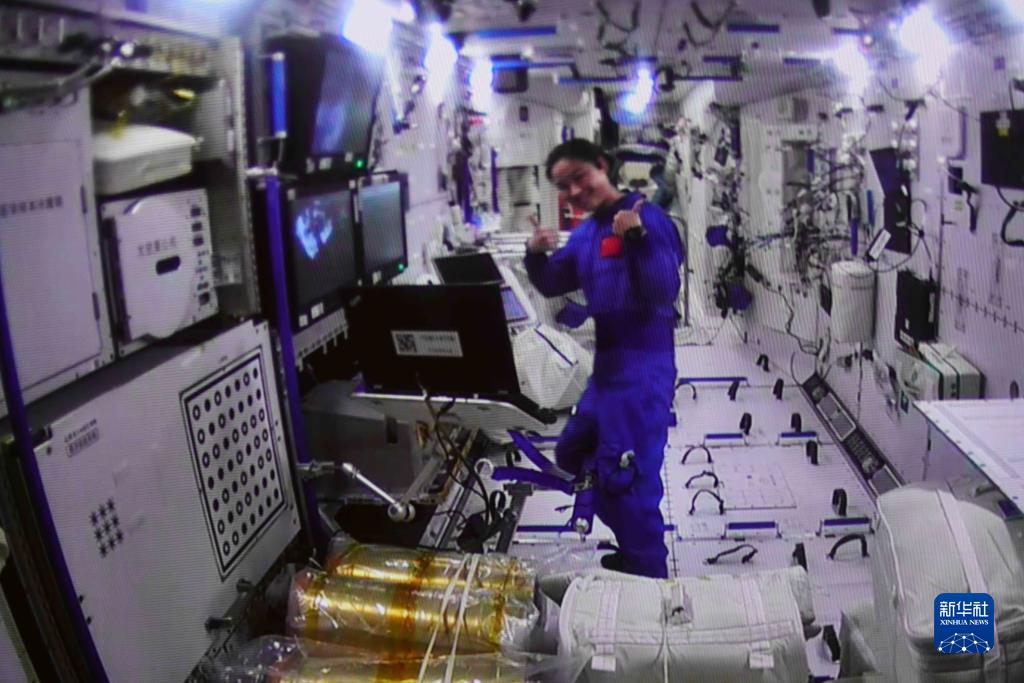 9月17日在北京航天飛行控制中心拍攝的神舟十四號航天員劉洋為圓滿(mǎn)完成出艙任務(wù)的航天員陳冬、蔡旭哲點(diǎn)贊的畫(huà)面。