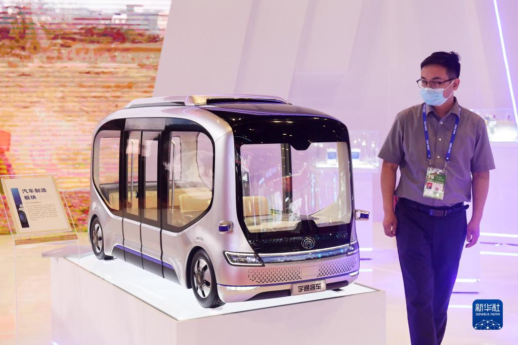 9月17日,在南寧國際會(huì )展中心,一名參觀(guān)者在觀(guān)看自動(dòng)駕駛巴士模型。