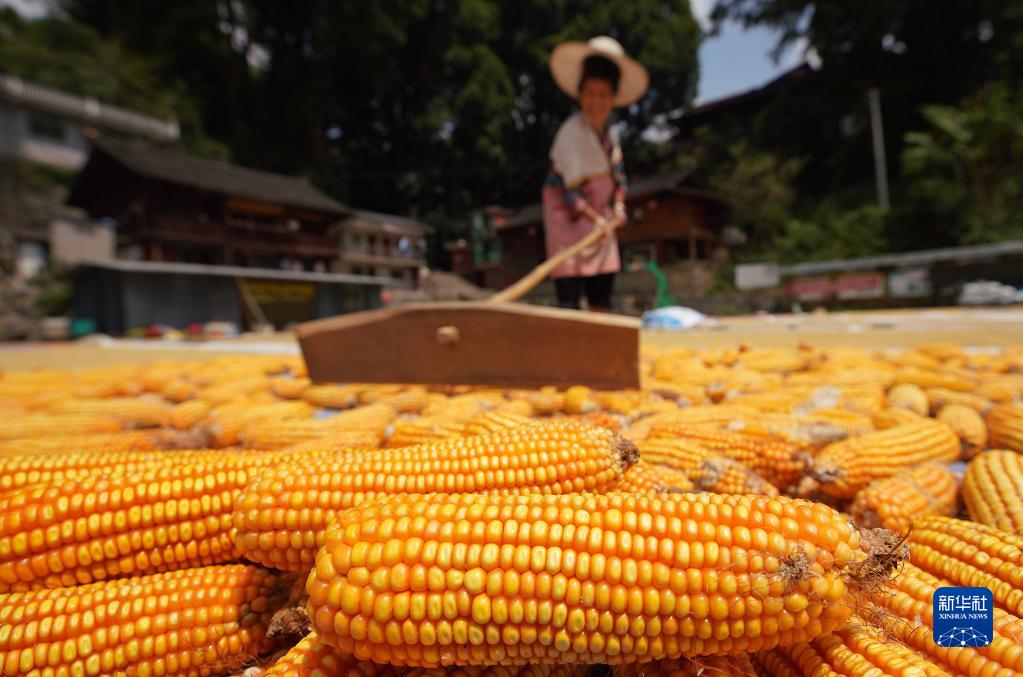 9月17日,村民在貴州省黔東南苗族侗族自治州丹寨縣興仁鎮巖英村晾曬玉米。