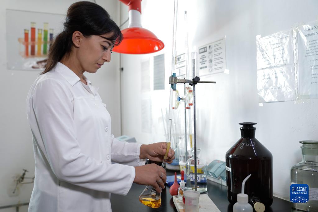 8月18日,在烏茲別克斯坦納沃伊市的納沃伊氮肥股份公司,烏方工作人員進(jìn)行產(chǎn)品檢測。