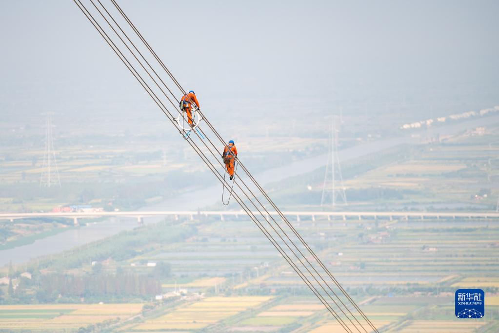 9月18日,在位于湖南省岳陽(yáng)市臨湘市的南荊長(cháng)特高壓工程螺山長(cháng)江大跨越施工現場(chǎng),國網(wǎng)山東送變電工程有限公司的工作人員調整間隔棒。
