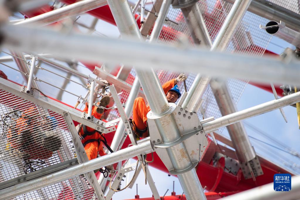9月18日,在位于湖南省岳陽(yáng)市臨湘市的南荊長(cháng)特高壓工程螺山長(cháng)江大跨越施工現場(chǎng),國網(wǎng)山東送變電工程有限公司的工作人員在高空作業(yè)。
