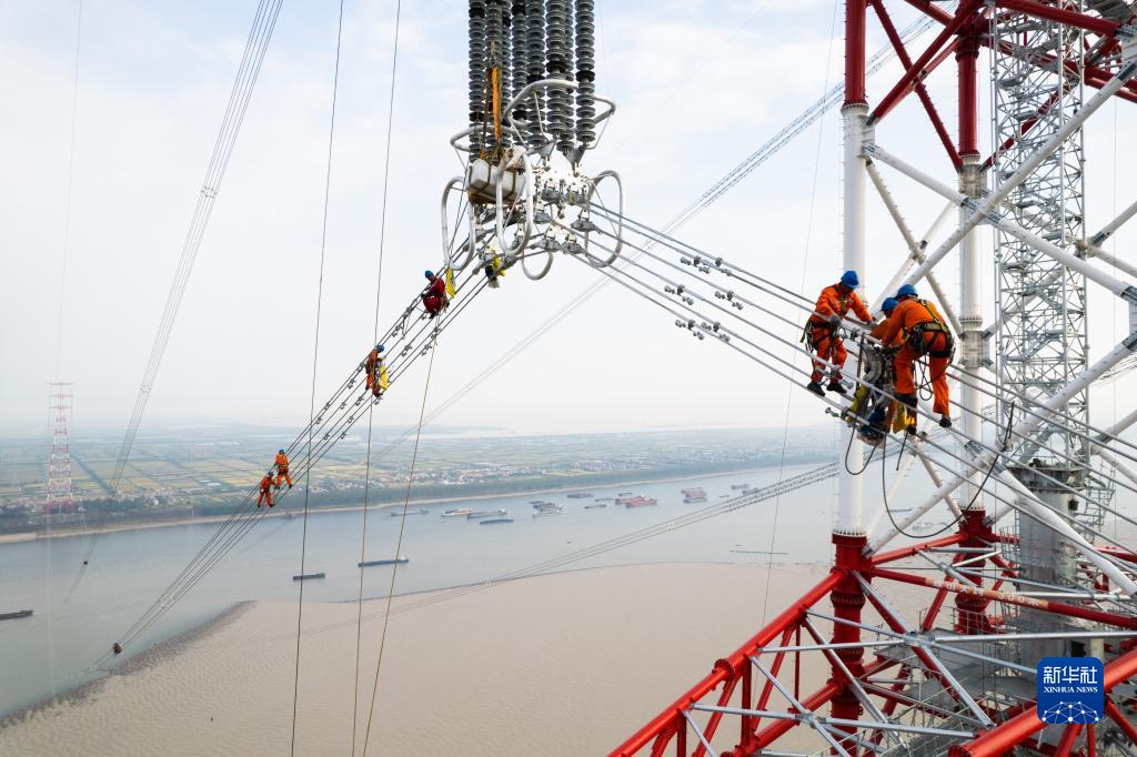 9月18日,在位于湖南省岳陽(yáng)市臨湘市的南荊長(cháng)特高壓工程螺山長(cháng)江大跨越施工現場(chǎng),國網(wǎng)山東送變電工程有限公司的工作人員安裝阻尼線(xiàn)(無(wú)人機照片)。