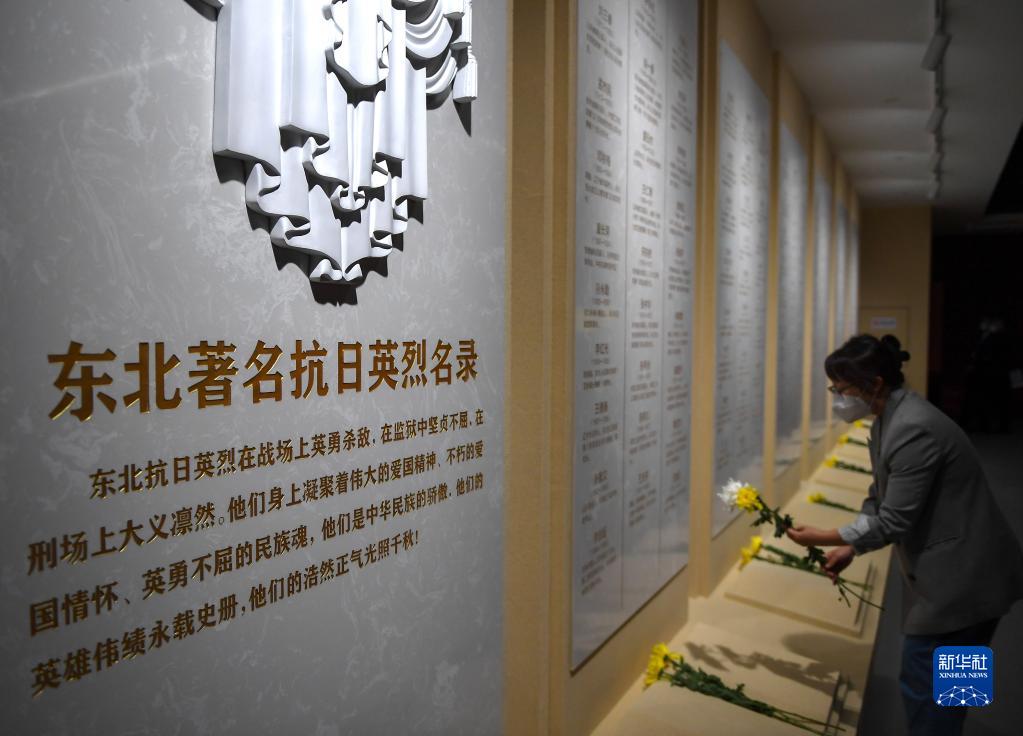 9月18日,參觀(guān)者在東北淪陷史陳列館向抗日英烈敬獻鮮花。