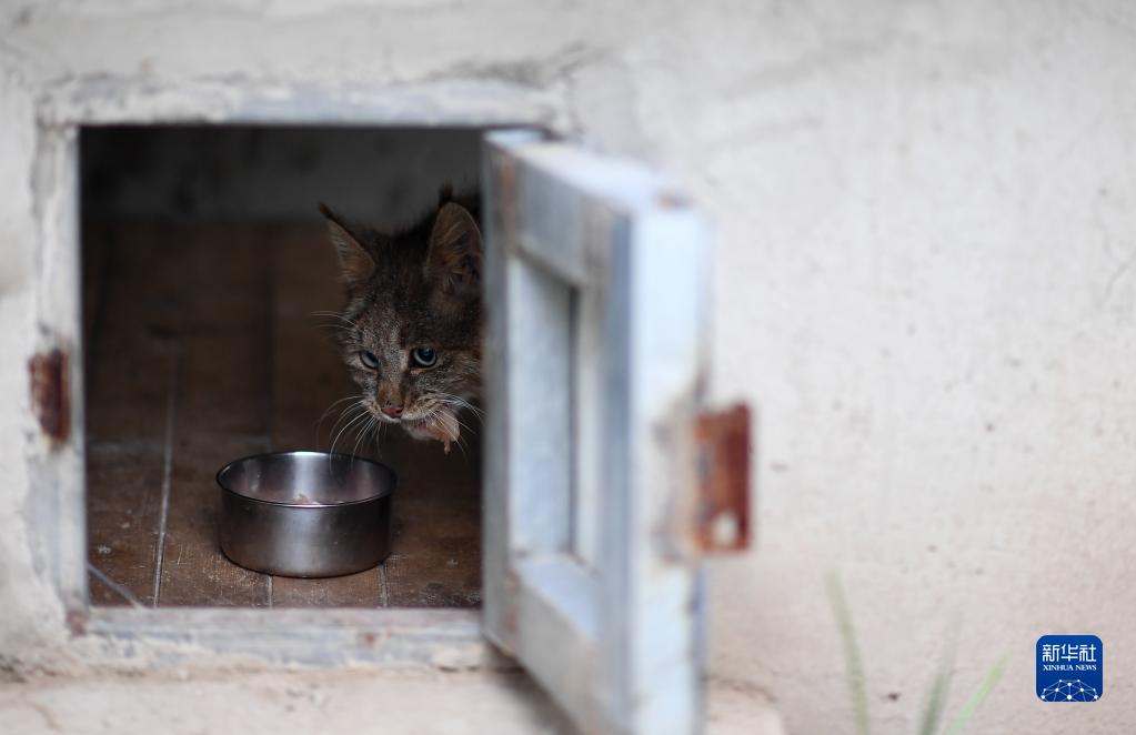 9月18日,受救護的荒漠貓在青海野生動(dòng)物救護繁育中心進(jìn)食。