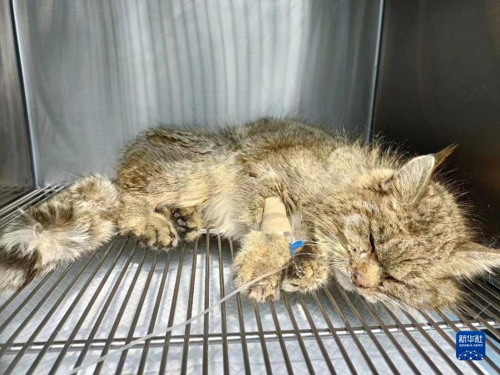 2022年3月21日,受救護的荒漠貓在青海野生動(dòng)物救護繁育中心接受治療。