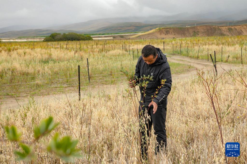 瑪曲縣自然資源局高級工程師馬建云在黃河瑪曲段干流沿岸一處阻沙林帶建設區域觀(guān)察植被生長(cháng)情況(9月16日攝)。