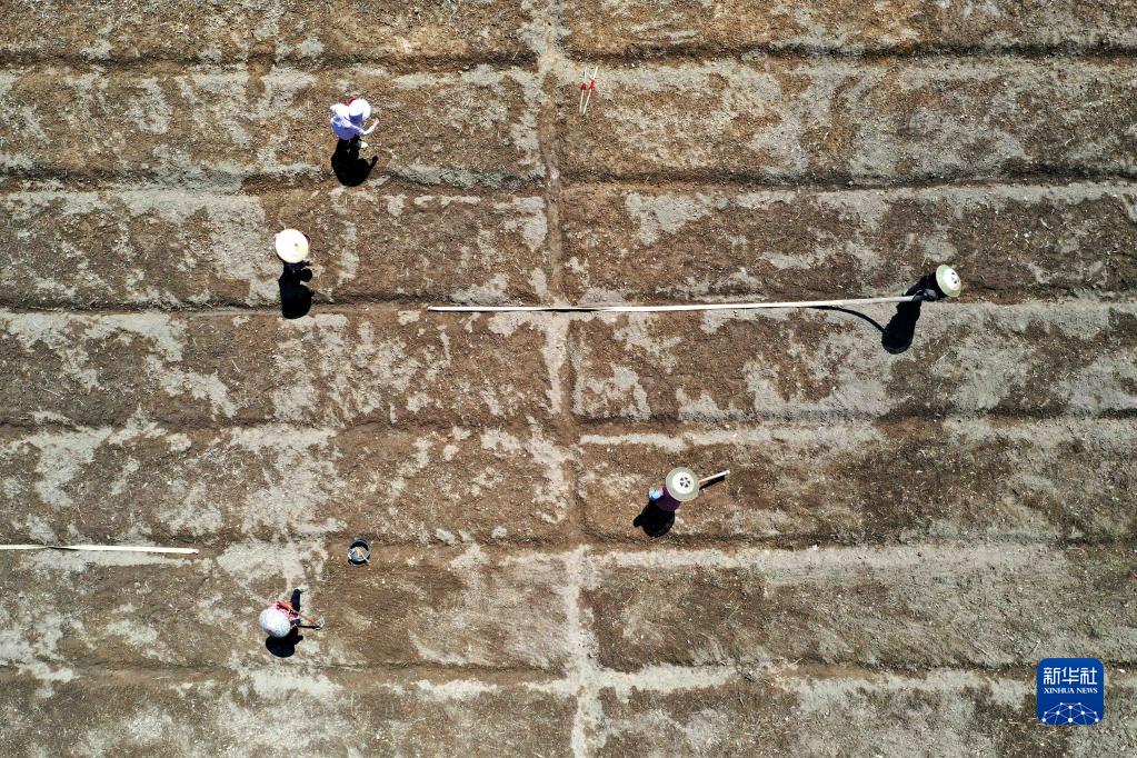 9月18日,貴州省黔南布依族苗族自治州都勻市小圍寨街道馬尾村的村民在播種油菜種子(無(wú)人機照片)。