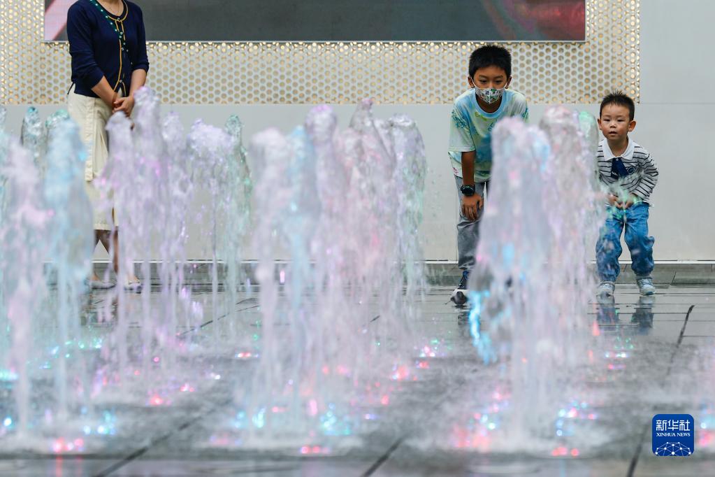 9月19日,孩子們在成都遠洋太古里欣賞音樂(lè )噴泉。