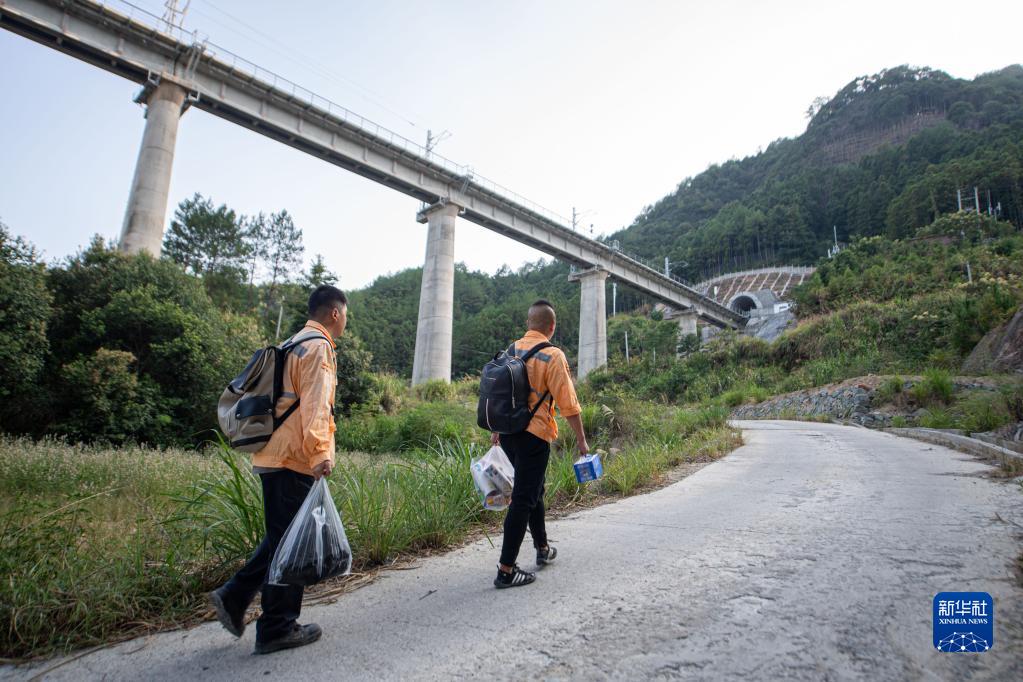 9月19日,看守員趙偉燈(右)與蔡金礦在前往赤嶺隧道防洪值守點(diǎn)的山路上行走。