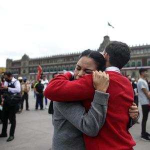 9月19日,在墨西哥首都墨西哥城,室外避險的人們相互安慰。