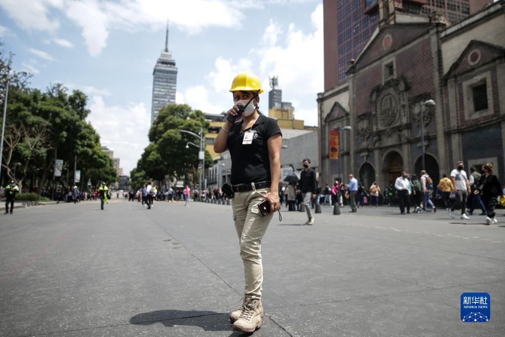 9月19日,在墨西哥首都墨西哥城,一名民防人員在街頭工作。