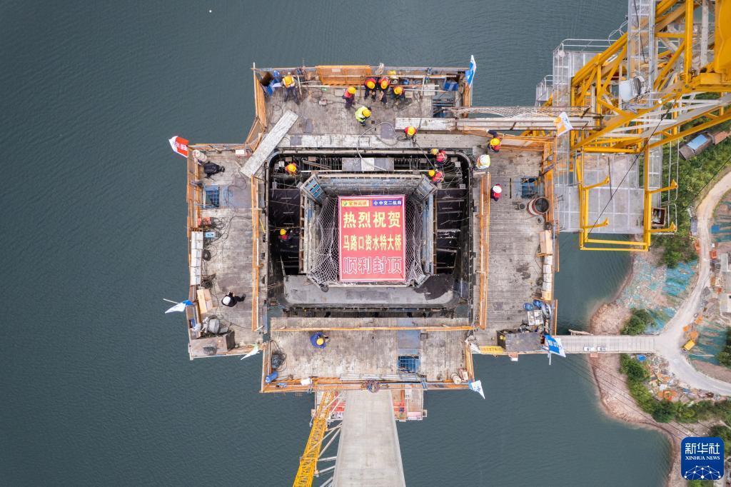 當日,官(莊)新(化)高速全線(xiàn)重點(diǎn)控制性工程馬路口資水特大橋主墩封頂,即將進(jìn)入橋梁上構施工階段,為早日通車(chē)運行奠定了基礎。馬路口資水特大橋位于湖南省益陽(yáng)市安化縣柘溪水庫內,全長(cháng)1187米,主跨500米,其中水中主塔高202.4米。
