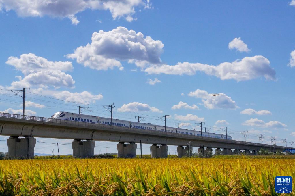 9月19日,在吉林省公主嶺市房身崗子村,一列高鐵列車(chē)從稻田間駛過(guò)。
