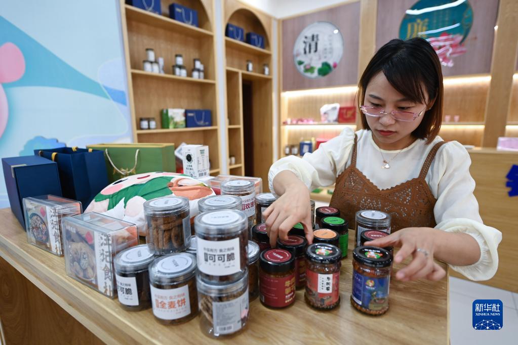9月21日,在杭州市臨安區昌化鎮白牛村電商大樓的農創(chuàng )客中心,張青整理要進(jìn)行直播銷(xiāo)售的特色農產(chǎn)品。張青回鄉聯(lián)合當地青年志愿者組建“云上白?!ね乃C”特色電商平臺,組織“農創(chuàng )客”開(kāi)展直播培訓。