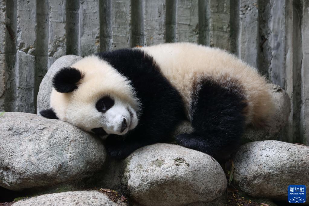 9月21日,成都大熊貓繁育研究基地的大熊貓“福多多”趴在石頭上休息。
