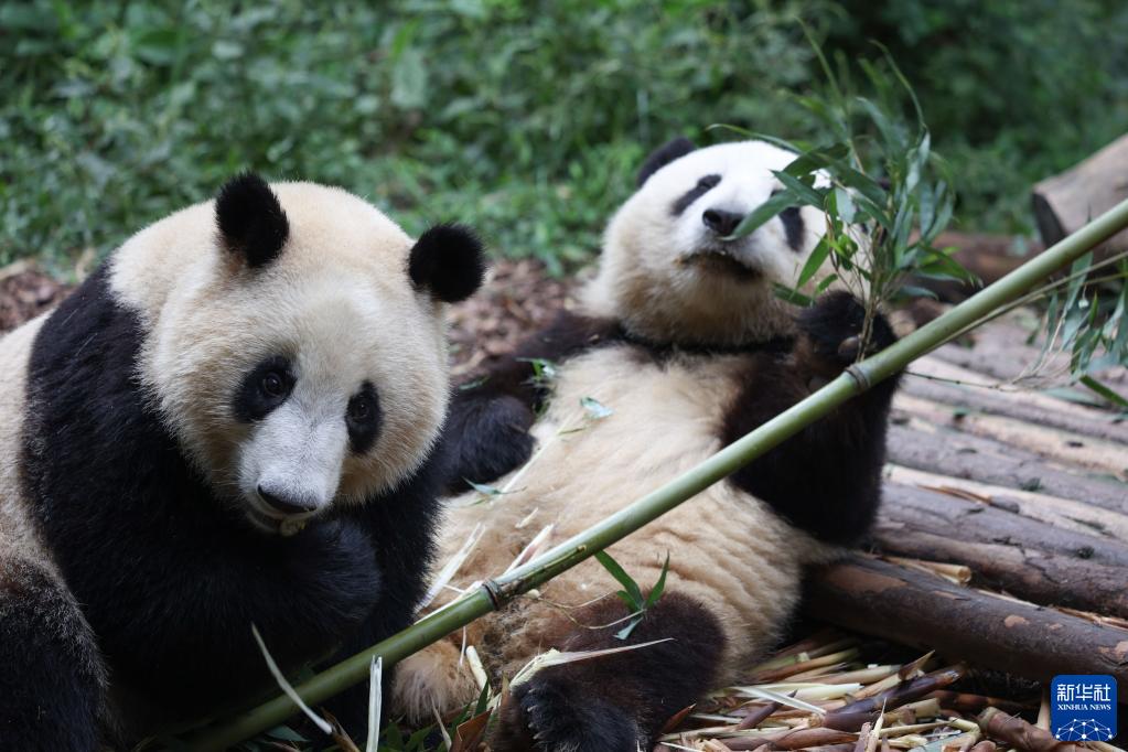 這是9月21日在成都大熊貓繁育研究基地內拍攝的大熊貓龍鳳胎姐弟“和花”(右)與“和葉”。