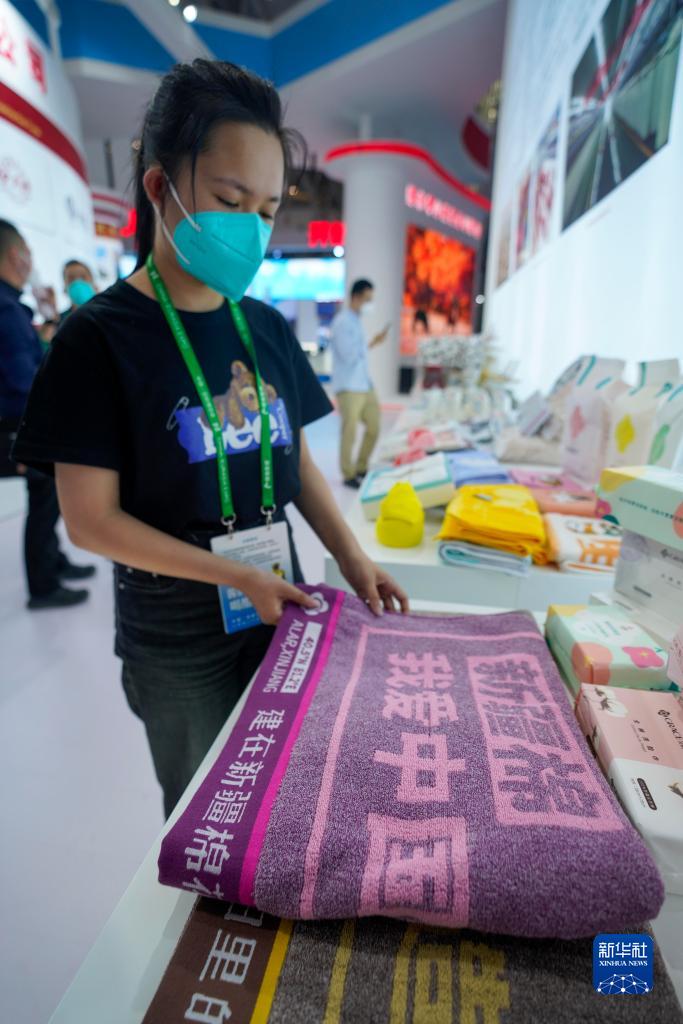 9月20日,在第七屆中國-亞歐博覽會(huì )上,參展商在整理由阿拉爾市所產(chǎn)的棉花加工而成的毛巾制品。