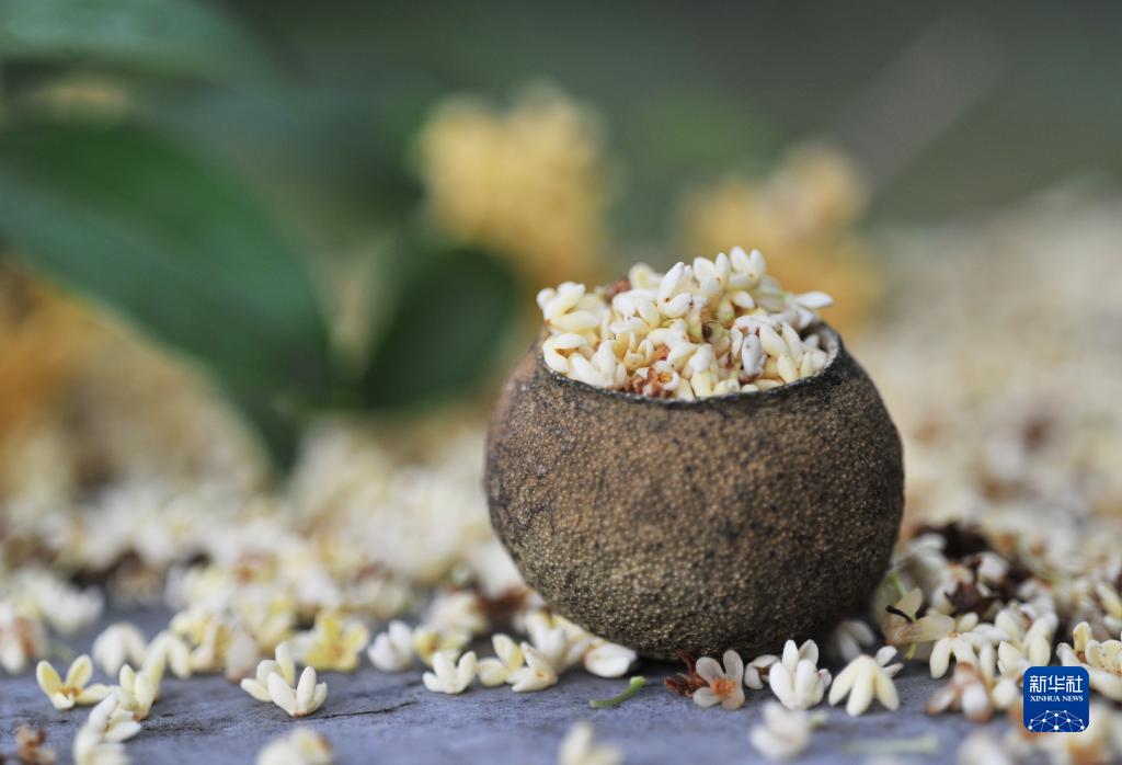云南省麗江市古城區一公園,小石桌上鋪滿(mǎn)桂花(9月16日攝)。