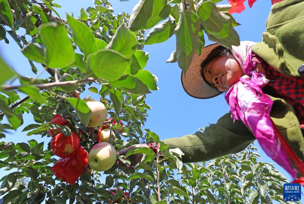 9月21日,在康平縣方家屯鎮,果農在果園給蘋(píng)果摘袋。